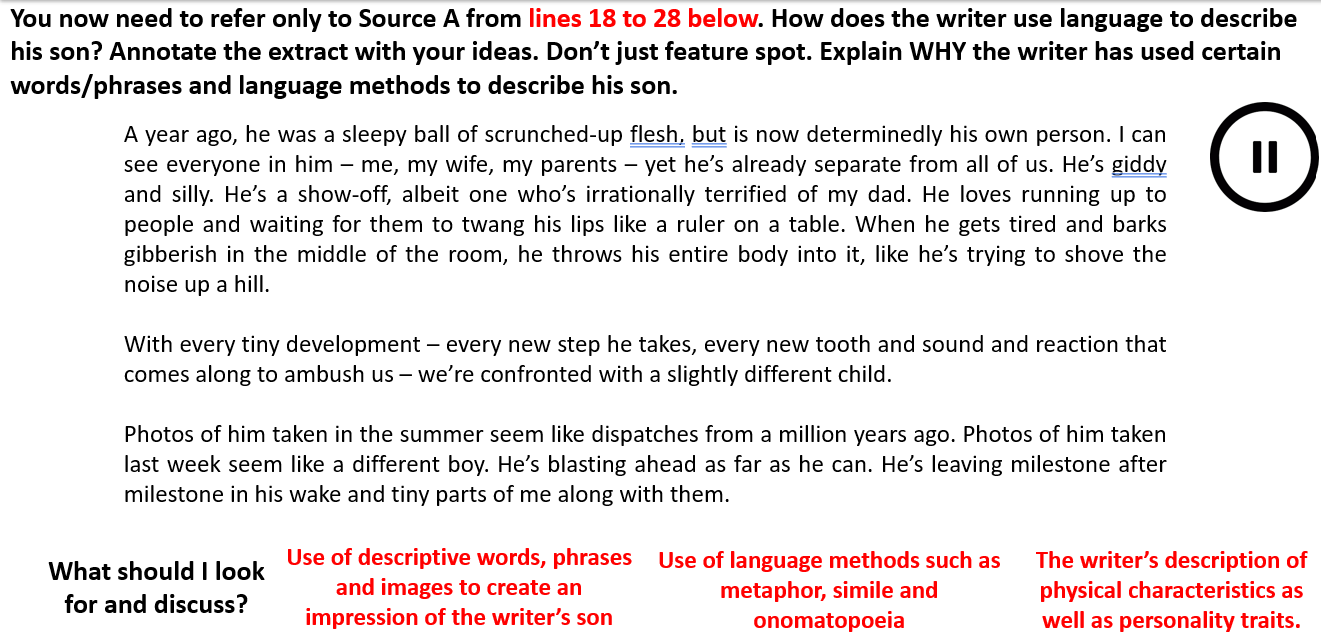 Use of descriptive words, phrases and images to create an impression of the writer’s son:
